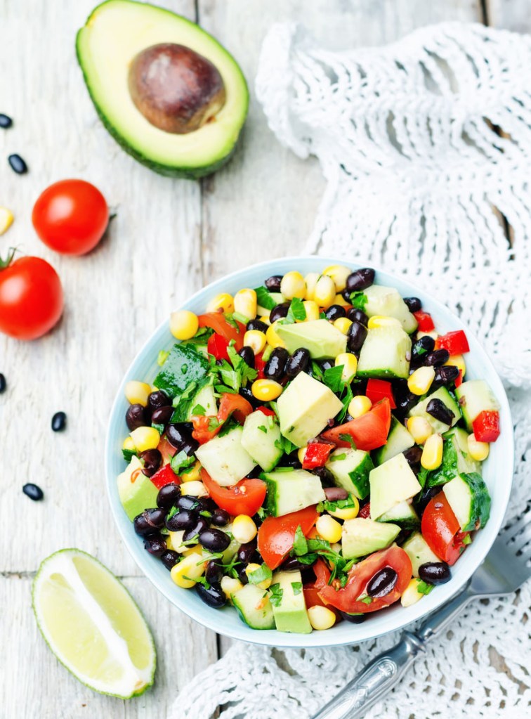 삶은 검정콩(블랙빈) 1컵, 잘게 썬 토마토 2개, 아보카도 1/2개, 오이 1/2개, 다진 양파 1/4개, 다진 고수 (또는 파슬리) 2큰술, 옥수수알(삶은 또는 통조림) 1/4컵, 다진 할라피뇨(선택) 1개, 라임즙 1큰술, 올리브오일 1큰술, 소금 후추 약간